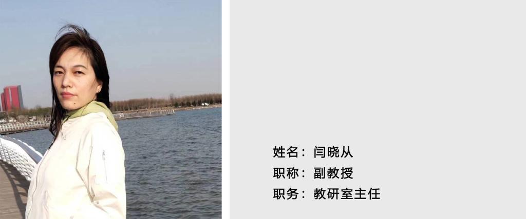 闫晓从,女,1979年9月出生,硕士,副教授,2003年毕业于河北建筑科技学院(现河北工程大学)工业设计专业,2011年取得河北大学艺术学硕士学位,现任河北地质大学艺术学院产品设计教研室主任。