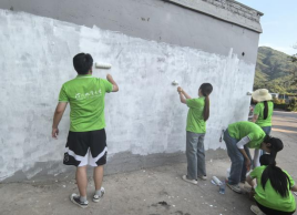 (图为实践团队成员墙绘绘制过程)