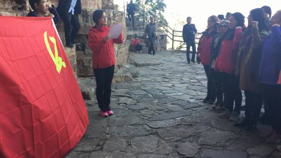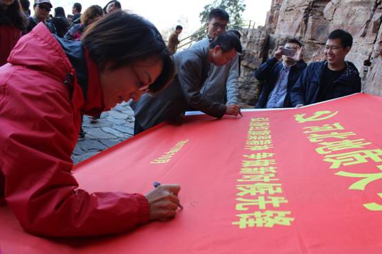 29日上午,学习班又前往红旗渠主干渠进行实地参观、现场学习。在参观主干渠的宏伟工程时,无论是年轻的亦或是上了岁数的老党员都从起点开始走完了整个行程,也重温了当年劳动人民开山造渠的艰辛和伟大的精神。最后,大家集体观摩了红旗渠咽喉工程--青年洞,并且在青年洞集体合影、宣誓,集体重温入党誓词,并在党旗上郑重签下自己的名字。