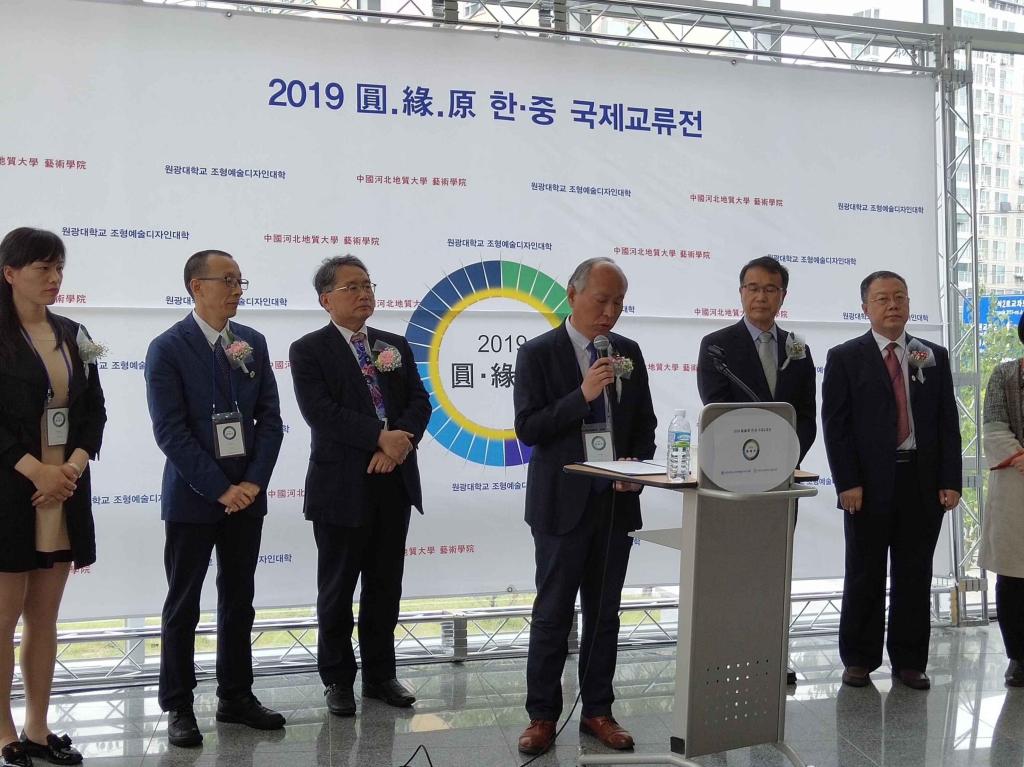 在开幕式上,韩国圆光大学副校长郑正权教授致辞,首先热烈欢迎远道而来的中国河北地质大学的教授们,并提起去年夏天在中国河北石家庄举办的第一届教师作品展览,称此次作品展是韩国圆光大学美术学院和中国河北地质大学艺术学院之间合作交流和友谊的继续,对于两校的人才培养、学科建设和设计理念都将起到推动作用。我校副校长侯书文教授致辞,对近年来两校开展的合作交流项目给予高度肯定,希望两校保持和加强合作交流,我校艺术设计学院院长齐勇教授也致辞祝愿表达了两校进一步深入合作交流的共同展望。