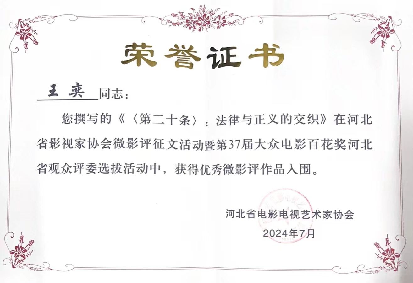我院21级影视摄影与制作专业学生王奕撰写的影评《〈第二十条〉:法律与正义的交织》荣获第37届大众电影百花奖河北省观众评委选拔活动的优秀微影评作品入围。在此次评选中,王奕同学凭借其敏锐的洞察力,深入剖析了影片中法律条文背后的伦理困境,探讨了正义追求的多重维度以及人性光辉的闪现,展现出其深厚的文学功底和扎实的法律素养。