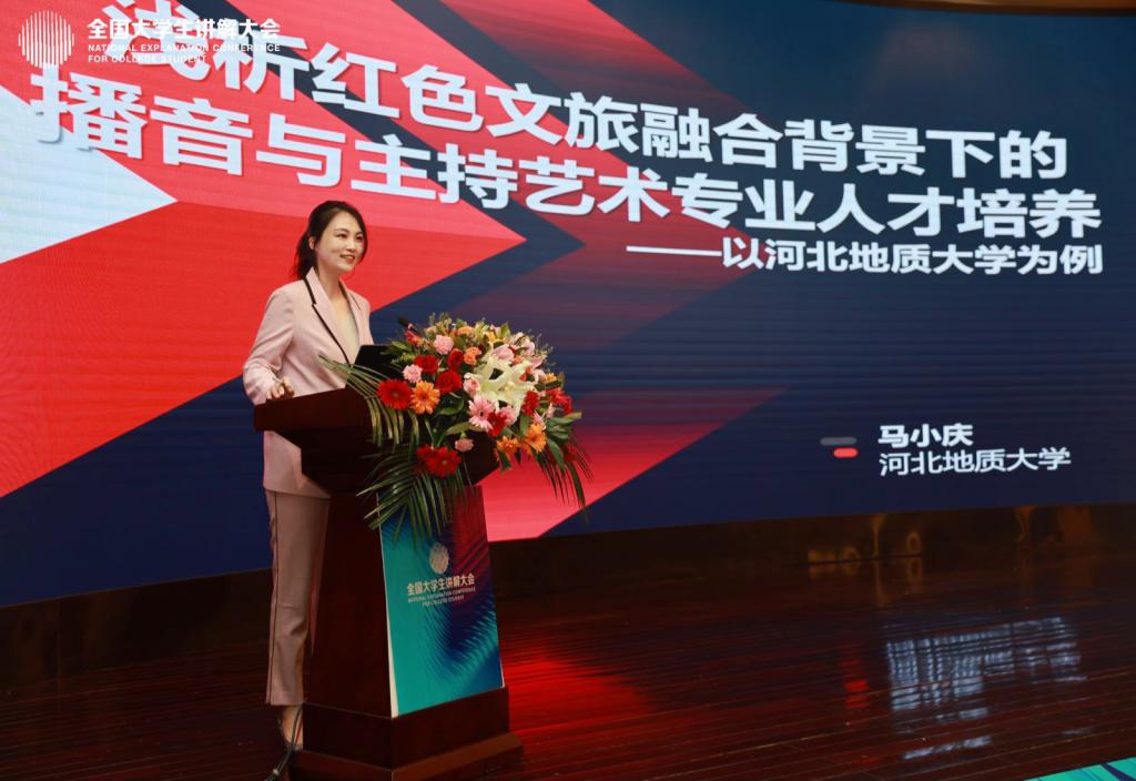第二分论坛主题为“大学生红色文化认同研究及青年学者论坛”,马小庆老师受邀发言。她主要以“在播音与主持艺术专业人才培养中结合解说话语样式重点解决的问题”、“红色文旅融合背景下播音与主持艺术专业人才培养的改革与创新”等经验与嘉宾和学者进行分享。中国传媒大学文化产业管理学院文化数字化实践中心主任靳斌教授作为点评嘉宾对马小庆老师的论文进行现场点评,首先肯定了河北地质大学播音与主持艺术专业在综合性院校里结合地方特色、学校特色的创新之举,也肯定了发言里提到的将播音拓展到讲解领域的合理趋势;之后靳斌教授就“讲解与播音主持艺术的共通之处”、“如何实现该专业学生缩短毕业到就业的时间”等问题与马老师进行了讨论;最后鼓励马老师要沿着这个创新和改革继续深入下去,在该领域进行更多的思考,形成更多的经验,分享给兄弟院校,一起拓展播音与主持艺术专业未来的发展道路。