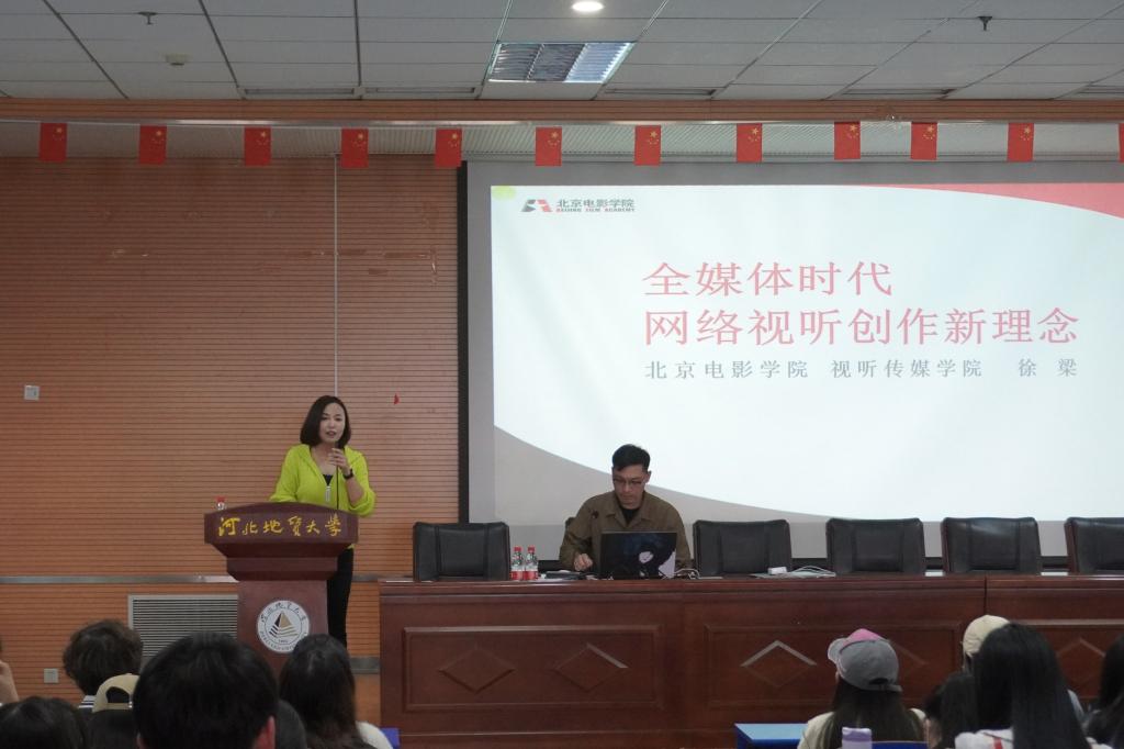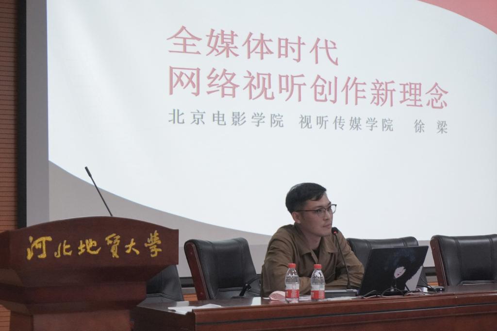 2023年4月27日下午15点30分,北京电影院专任教师、北京师范大学戏剧与影视学专业博士,青年导演、撰稿人,徐梁老师在河北地质大学(北校区)仰山慕水报告厅为学院师生作了题为“全媒体时代网络视听创作新理念”的学术讲座,广播电视编导教研室师柔剑主任主持了讲座。播音与主持艺术专业学科带头人胡黎娜老师,广播电视编导教研室专任教师,21级和22级广播电视编导、影视摄影与制作专业部分学生,共300余人聆听了讲座。
