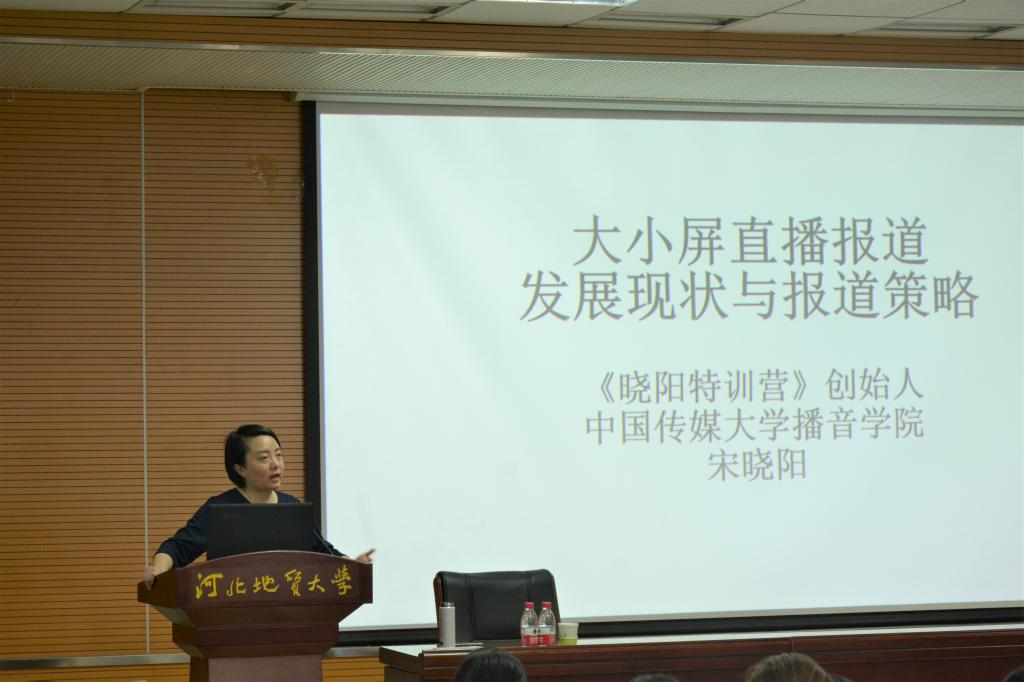 2018年10月15日下午,影视艺术学院特别邀请中国传媒大学播音与主持艺术学院的宋晓阳副教授带来了一场主题为《大小屏直播报道发展现状与报道策略》的讲座。学院陈烈院长、宋朝霞书记、播音与主持艺术专业教研室教师及播音与主持艺术专业的2016级、2017级学生聆听了讲座。