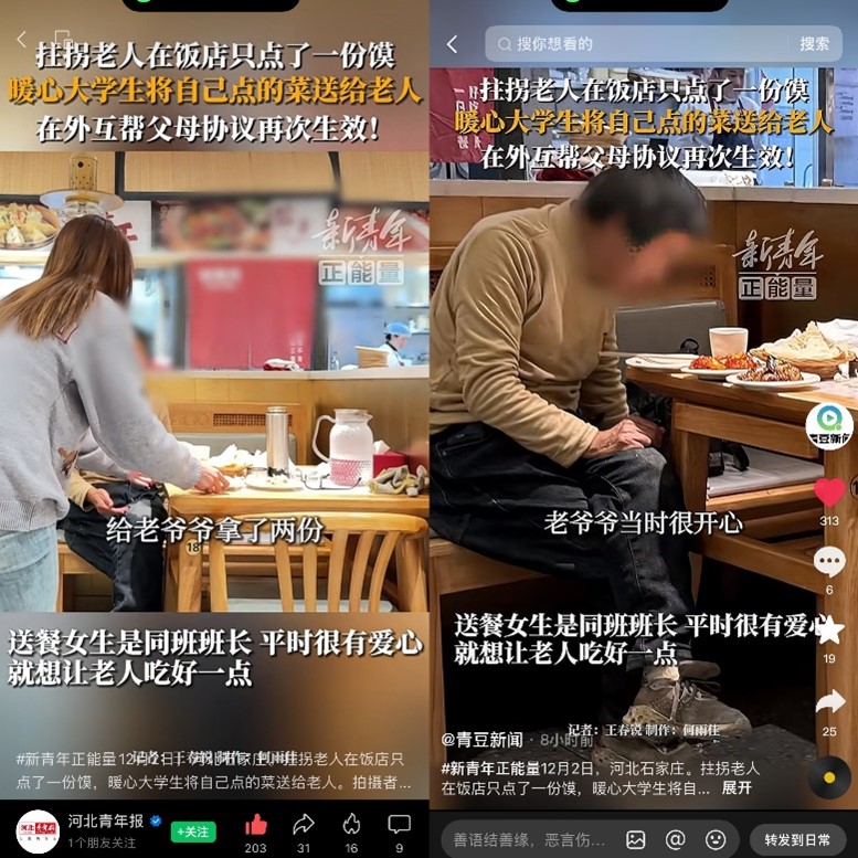 目睹此景,焦雨桐同学内心一阵触动,泛起丝丝酸楚。她心想,老爷爷这般清苦,要是能给他送上可口饭菜,或许能为他带去一点慰藉。想到这,她的眼眶不禁湿润了。很快,她与同学一拍即合,将两份热气腾腾的饭菜端到老爷爷面前。老爷爷看到这突然的关怀,先是一愣,随后脸上露出了质朴而真挚的笑容,眼中满是感激。他不住地点头,嘴里连声道谢,还和焦雨桐同学愉快地交谈起来。在交流中,焦雨桐真切感受到了助人的快乐与满足。事后,她的这一行为也被河北青年报、青豆新闻网等多家媒体报道。
