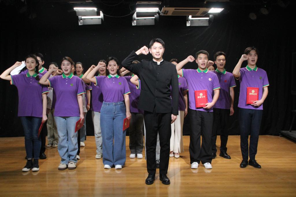 比赛最后,宣读入选人员名单并为韵声全体新成员颁发团徽,为前五名颁发荣誉证书。在“韵声”艺术团团长的带领下,17位新团员郑重宣誓——“我们愿用我们的灵魂:朗诵山水 演绎人生!