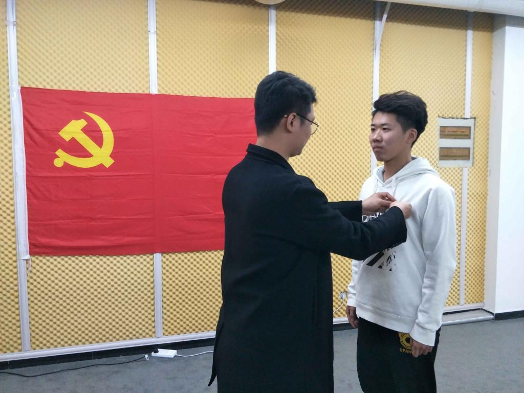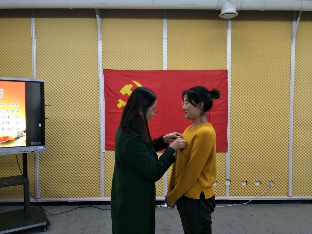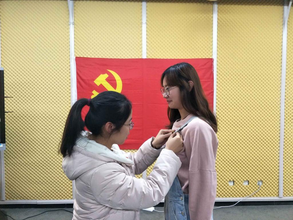 大会在庄严的国歌声中拉开序幕,8名预备党员在陈青青同志的领誓下,面向党旗庄严宣誓,而后由影视艺术学院党委书记宋朝霞、学生辅导员陈青青、施玉杰、郑慧为8名预备党员佩戴党员徽章。预备党员齐表决心,不仅要在组织上入党,也要在思想上入党,用实际行动践行入党誓词。