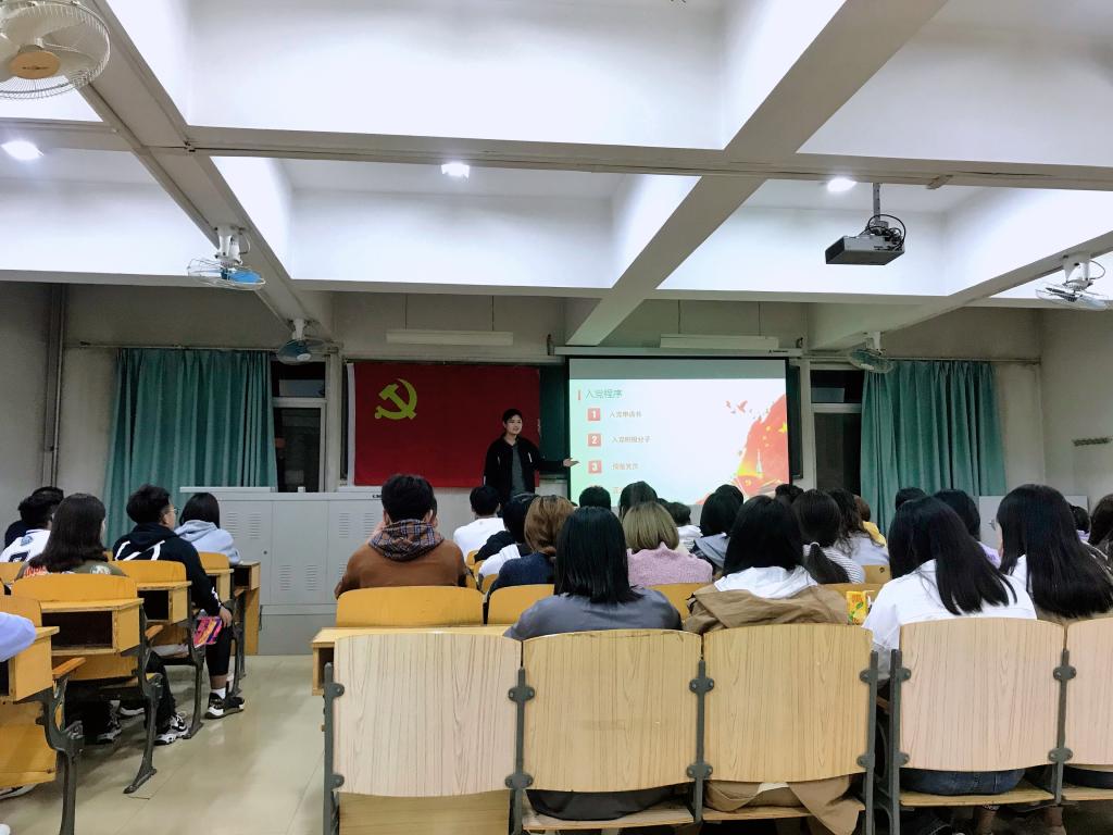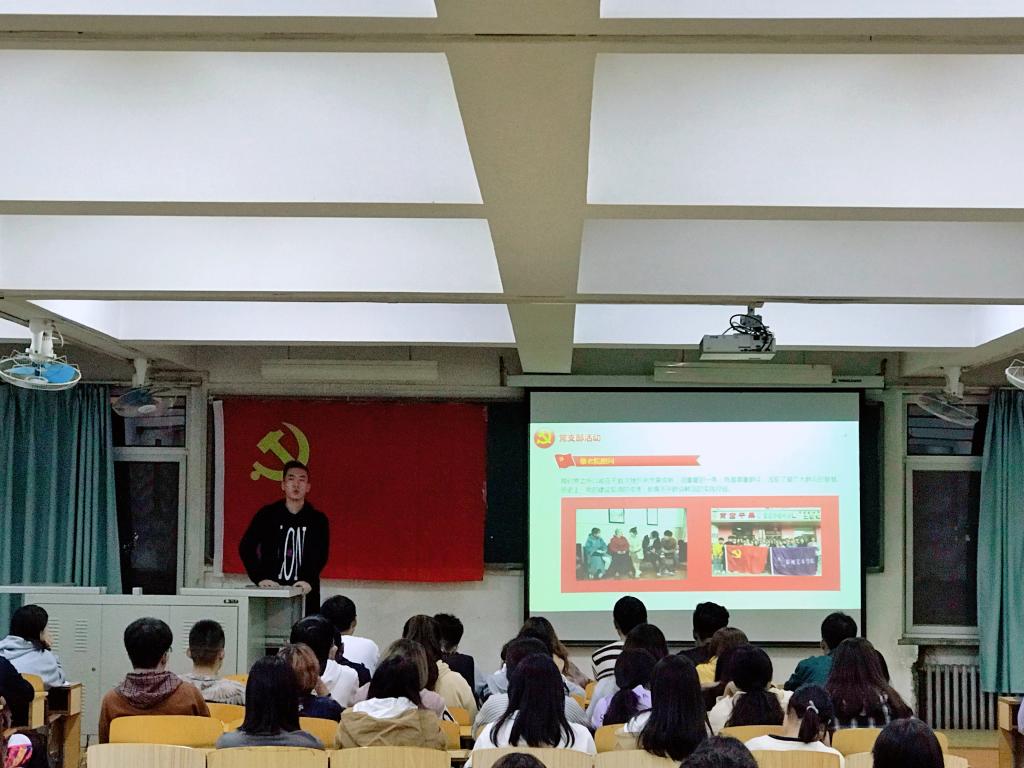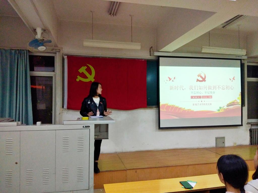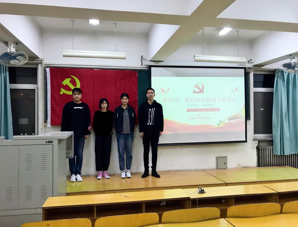 2019年10月9日、10日晚,影视艺术学院2019级新生党课宣讲会暨“新时代,我们如何做到不忘初心”党日活动分别在教二201召开,活动由学生党支部书记陈青青老师、2019级学生辅导员孙怀章老师指导,党课宣讲团成员进行全面讲解。